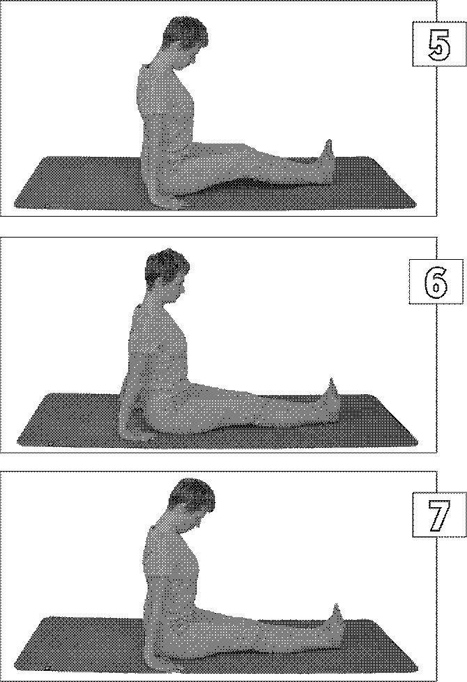 6. Упрощенный вариант: садимся с прямыми ногами, но ладони отведены назад, указательные пальцы касаются ягодиц. Замыкания подбородком нет.