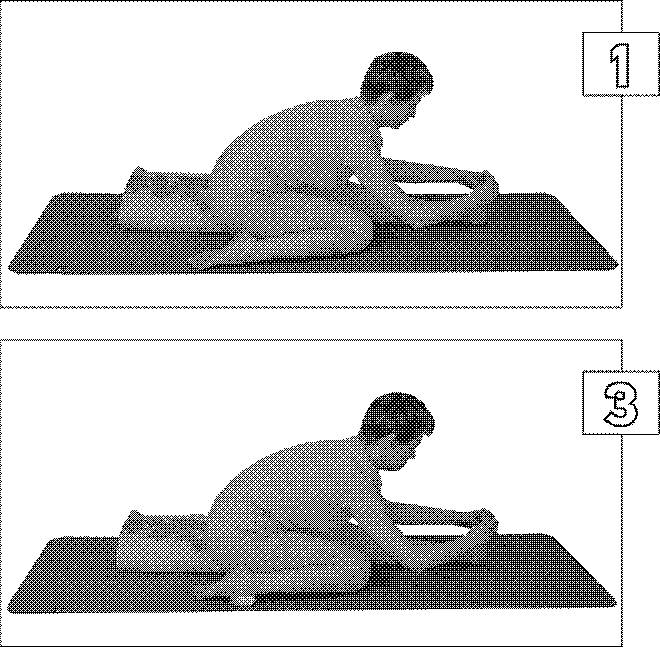 2. Ноги вместе и вытянуты вперед, немного согнуты в коленях. Руки выпрямлены в локтях. Ладони возле тазобедренных суставов.