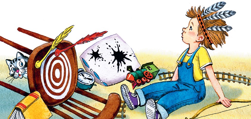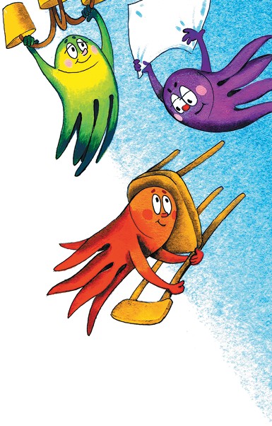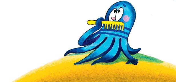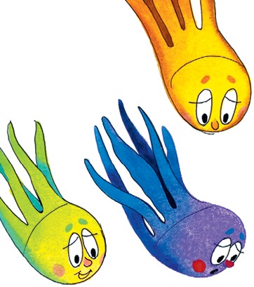 Только мама за порог,Малыши с кровати – скок,Стулья – хвать,Подушки – хвать,И давай воевать!Долго сонный осьминогНичего понять не мог:Жёлтый сынСидит в графине,По буфету скачет синий,А зелёный на люстре качается…Ничего себе день начинается!А близнецы, близнецыВзяли ножницыИ иголкой остроюПарус шьют из простыни.И только полосатыйОдин сидит в сторонкеИ что-то очень грустноеИграет на гребёнке.(Он был спокойный самый,На радость папы с мамой.)– Вот я вам сейчас задам! –Крикнул папа малышам. –Баловаться отучу,Всех подряд поколочу!