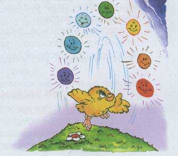 Взглянул цыплёнок на радугу и улыбнулся: да ведь солнышко совсем не жёлтое. Оно разноцветное. Как матрёшка. Открой жёлтую матрёшку - в ней синяя. Открой синюю - в ней зелёная. Открой