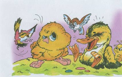 Друзей у цыплёнка было мало. Всего один. Это потому, что он искал друзей по цвету. Если жёлтый - значит друг. Если серый -нет. Если бурый - тоже нет. Шёл как-то цыплёнок по зелёной