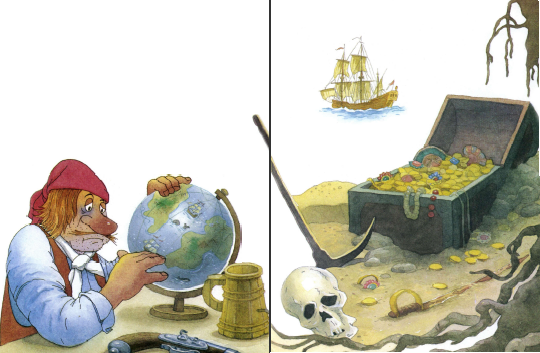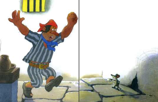 Откуда ни возьмись, мышка выскочила — и уставилась на пирата. А он по полу ножищей как грохнет, как рявкнет во всю глотку: «Кышшшш!» Мышка вдруг и говорит ему: «Дурак! Я тайный ход знаю! Но теперь, раз ты такой злюка, не покажу!» Пискнула и убежала. Схватился пират за голову и зубами заскрежетал от злости на себя. И понял, что понапрасну нечего даже мышек обижать.
