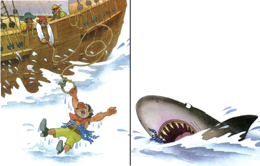 Ну, акула с ним чикаться не стала и решила проглотить вместе с тельняшкой. Но, когда она его глотала, пират зацепился за акулий острый зуб и ни туда ни сюда. Акула мучилась-мучилась и выплюнула его, подумав: «Зачем мне дырявая тельняшка?..»