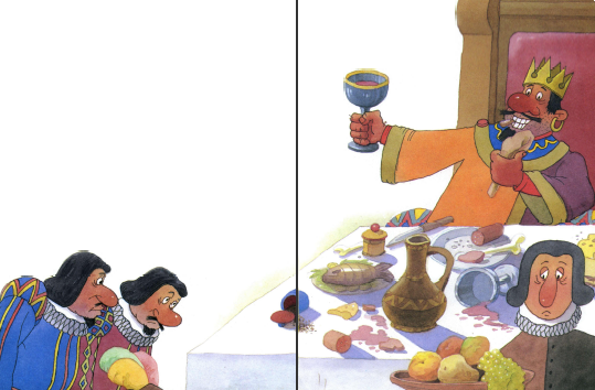 Удивились слуги: сроду они от своего короля ни одного грубого слова не слыхивали. А тут — нате! Но виду не подали. Глядь — уже везут на тележках еду всякую, жареную и пареную, сладкую и солёную, в общем, такую, что пальчики оближешь. Ложки и кубки подают серебряные, а тарелочки — фаянсовые: ешь, пей, сколько влезет! Разморило пирата от обеда, в сон потянуло. Стал он носом клевать. А придворные тут как тут: