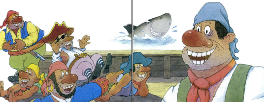 Пират смотрел в зеркало и любовался зубами. И вообще он понял, что улыбка ему очень идёт, обрадовался, как ребёнок, и первый раз в жизни засмеялся.