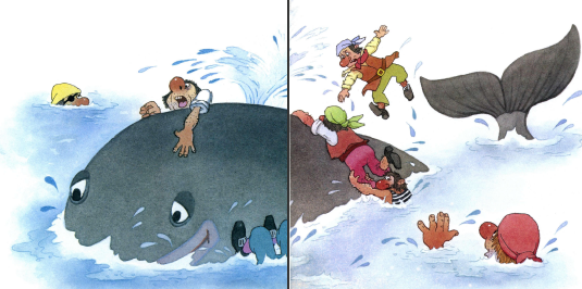 Прыгнули пираты в море и ждут. Не долго ждали. Смотрят: кит на горизонте появился. Как только он к ним подплыл, тут китовый наездник сразу его оседлал и в усы руками вцепился. Кит и притормозил. Ну пираты к нему на спину всей гурьбой и влезли. Пришпорили кита голыми пятками — и понёс он их по волнам так, что брызги солёные по сторонам разлетаются.