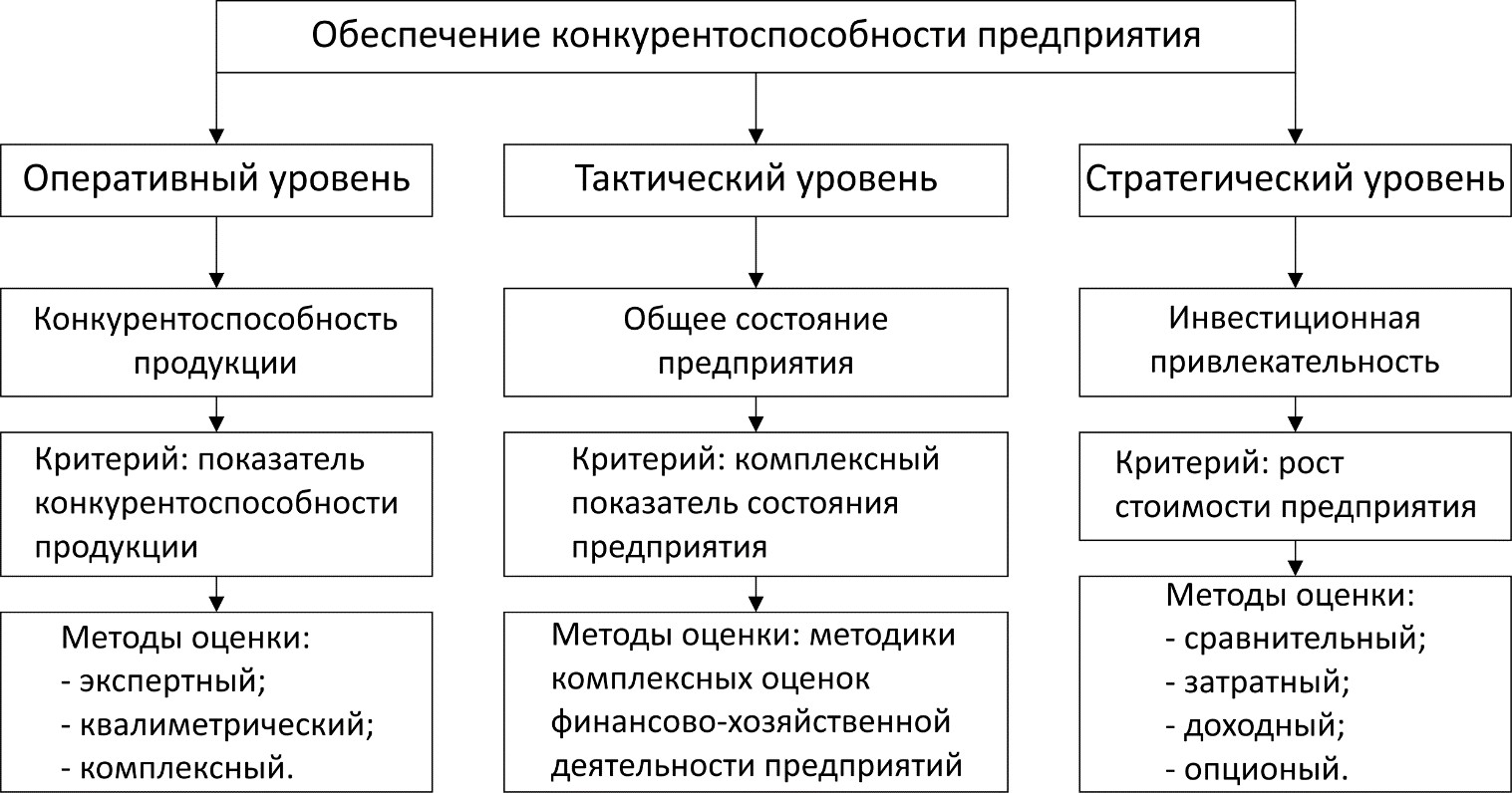Существуют три уровня обеспечения конкурентоспособности предприятия: стратегический, тактический и оперативный, которые представлены на рисунке 1.7.