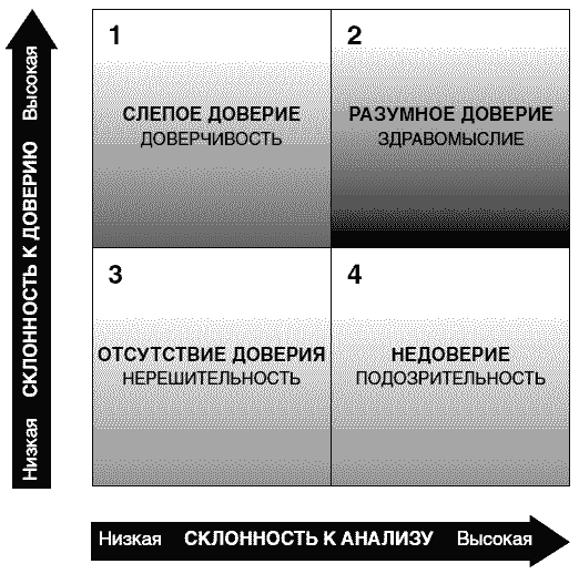 Если нанести два компонента разумного доверия (склонность к доверию и способность анализировать ситуацию, риск и надежность) на оси координат, мы получим матрицу, разделенную на четыре четверти-зоны. К зоне 1 относится доверчивость, или слепое доверие, сочетающее высокий уровень склонности к доверию и низкий уровень анализа. Сочетание высоких уровней склонности к доверию и анализа приводит нас в зону 2, соответствующую разумному доверию. Когда и склонность доверять, и уровень анализа невысоки, мы пребываем в состоянии нерешительности, неопределенности и отсутствия доверия, то есть находимся в зоне 3. Наконец, отсутствие склонности доверять в сочетании с обстоятельным анализом влечет за собой подозрительность, или недоверие, приводя нас в зону 4.