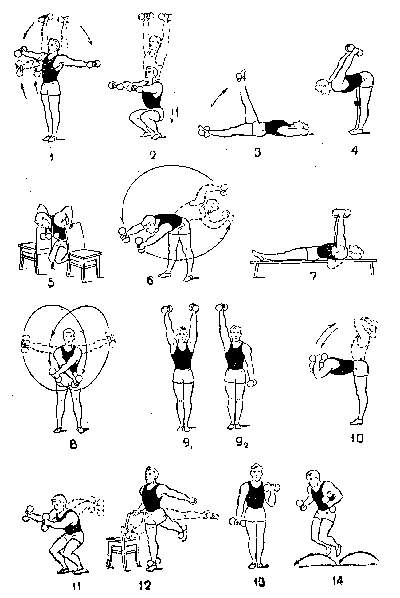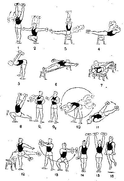 14-е упражнение (см. рис. 2). Одновременное и попеременное выжимание гантелей. При поднимании гантелей вверх вдох, при опускании выдох.