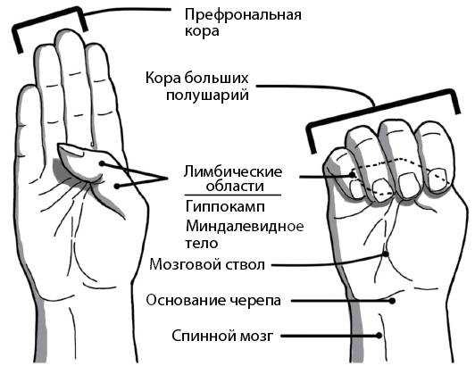 Рис. 1.2. Ручная модель мозга. По Siegel (2010a, стр. 15). Адаптировано с разрешения Bantam Books. © 2012 Mind Your Brain, Inc.