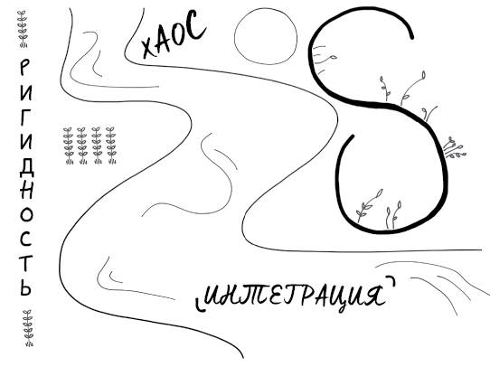 Чтобы понять, что такое интеграция, мы должны глубже раскрыть два ее фундаментальных компонента: «дифференциацию» и «связывание». Дифференциация показывает, как части системы могут стать отдельными, уникальными, индивидуальными в своем развитии. Связывание же предполагает соединение отдельных аспектов системы друг с другом; для разума здесь часто важны внутренние ассоциации и межличностное взаимодействие. Когда дифференцированные элементы соединяются, они сохраняют некоторые из своих существенных качеств, становясь при этом частью функционального целого. Благодаря интеграции целое становится больше суммы его частей. В математике мы используем термины «сложность» и «когерентность», чтобы описать такую связь дифференцированных частей. В теории сложности, как упоминалось выше, термин «критичность» используется для обозначения «постоянно меняющейся зоны противостояния между ригидностью и анархией, единственного места, где сложная система может быть спонтанной, адаптивной и живой».17 Критичность – это математическое пространство, связанное с тем, что мы можем визуализировать как Реку Интеграции и что мы можем определить как поток, обладающий гибкостью, адаптивностью, последовательностью, энергичностью и стабильностью. Этот центральный поток обладает гармонией. Вне этого гармоничного интегративного движения характеристики резко расходятся с характеристиками встречного потока: один берег этой Реки Интеграции – это хаос, а другой – ригидность (см. рис. В.3).