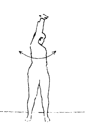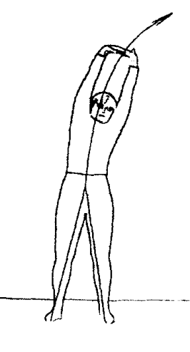 Спина прямая, руки подняты вверх, чуть согнуты в локтях, сильно растягиваем тело, опираясь в пол ногами очень сильно. Тело прогибаем в бок, как будто легли на большой шар боком. Руки тянутся вверх и в сторону.