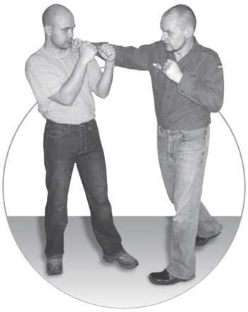 Прямые удары в лицо и корпус – основа всего, но они могут оказаться и самыми бесполезными действиями (рис. 3). В них можно вложить достаточно силы, но их траектории слишком предсказуемы, от них легко защищаться. Тем не менее прямые удары, примененные с умом, могут решить исход боя. Старайся бить, поворачивая кулак так, чтобы обратная сторона ладони смотрела вверх. Локоть в начале удара оставляй опущенным вниз, не выноси его слишком далеко в сторону, чтобы не открыть бок для упреждающей атаки врага. При ударе можно чуть сильнее согнуть колени, чтобы стать ниже и направить удар под рукой противника. Можно, напротив, ударить над рукой, тогда от прямого удара будет сложнее защититься. Будь готов ударить в любой момент, держи противника в напряжении. Разбитая прямым ударом бровь может залить ему кровью глаза. Рассчитывать на это не стоит, но сбрасывать саму возможность со счетов тоже не надо.