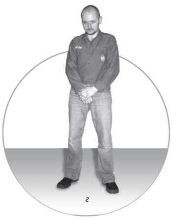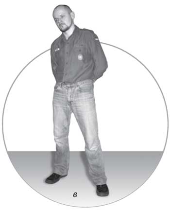 Готовясь к бою, планируй свои защиту и нападение. Стоять нужно «ноги врозь», колени чуть согнуты, чтобы тебя было не так легко сбить с ног. При этом не разворачивайся к противнику полностью, чтобы не открыть пах для удара (рис. 1). Пусть на пути стопы врага окажется колено или бедро – больно, неприятно, но не так опасно, как удар по яйцам.