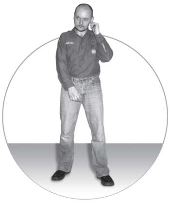 Рис.2. Правильная позиция. Внешне ты не провоцируешь драку, а в задумчивости почесываешь мочку уха. На самом деле это поза боевой готовности: правая рука прикрывает пах и печень, левая – голову, подбородок опущен, ноги в устойчивой позиции (левая чуть впереди, вес тела распределен равномерно).