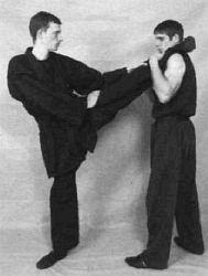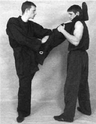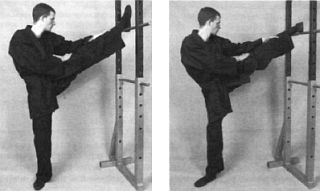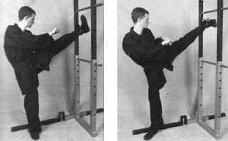 После всех основных упражнений на растяжку полезно сделать 8-10 махов каждой ногой вперед и вверх для того, чтобы расслабить связки и бицепсы бедер. Нога прямая, носок вытянут. Из основной стойки (урок № 5) делаете мах «задней» ногой и возвращаетесь обратно в стойку. Если вы выполните махи после упражнений на растяжку, то на следующий день ваши ноги будут болеть гораздо меньше. Впоследствии постепенно переходите к махам «передней» ногой, причем не опускайте ее на пол после каждого маха. Помимо своего прямого назначения, это упражнение улучшит ваше чувство равновесия и, возможно, сыграет некоторую роль в формировании привычки работать в спарринге именно «передней» ногой.