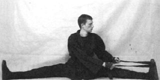 Итак, вы сидите на полу, ноги максимально разведены в стороны. Возьмите пояс или веревку, накиньте ее на стопу и медленно тянитесь к колену, сохраняя спину прямой. После полутора минут растяжки клевой ноге полторы минуты тянитесь к правой ноге.