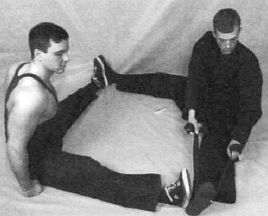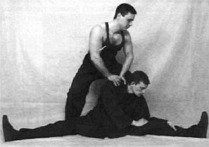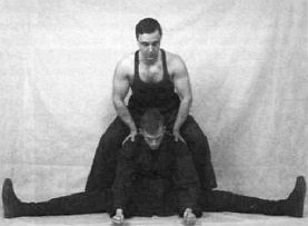 Еще один вариант растяжки с помощью напарника — он, стоя сзади вас, давит вам на плечи, обеспечивая максимальные наклоны к середине и к коленям.