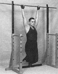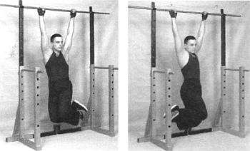 Отличное упражнение для развития трицепса и низа грудных мышц. Подпрыгните и выйдите в исходное положение со скрещенными ногами, согнутыми под углом 90 градусов. Из исходного положения медленно опуститесь вниз и отожмитесь от брусьев в два раза быстрее опускания. Невредно перед выполнением этого упражнения отжаться от пола в одном подходе 3–4 раза для разминки. Для тех, кто сразу отжаться от брусьев не может, необходима помощь партнера или тренера. В процессе выполнения упражнения он будет поддерживать вас снизу за одно из коленей, синхронно приседая при ваших опусканиях и опять-таки ногами помогая вам сделать необходимое количество повторений.