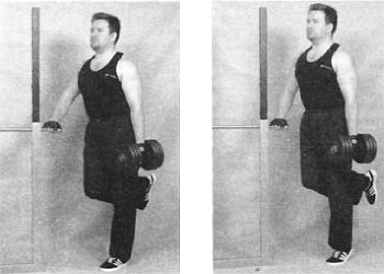 Возьмите гантели по 8-10 кг и примите то же исходное положение, как и в предыдущем упражнении. Теперь немного отведите руки от туловища до положения, специально показанного на фотографиях.