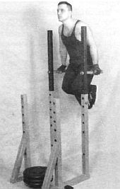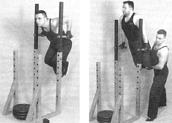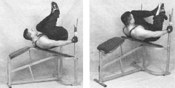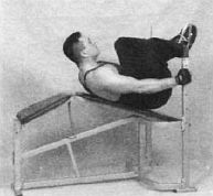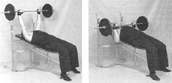 Не буду спорить, добавлю лишь, что, на мой взгляд, это упражнение еще и дает мощный силовой толчок в жимах лежа. В этом упражнении вы впоследствии сможете взять вес на 5—10 кг больше, нежели в горизонтальном жиме, что потом весьма существенно отразится на этом жиме и наклонном жиме лежа. А пока что не торопитесь и с тем же весом, что и в предыдущем упражнении, освойте технику.