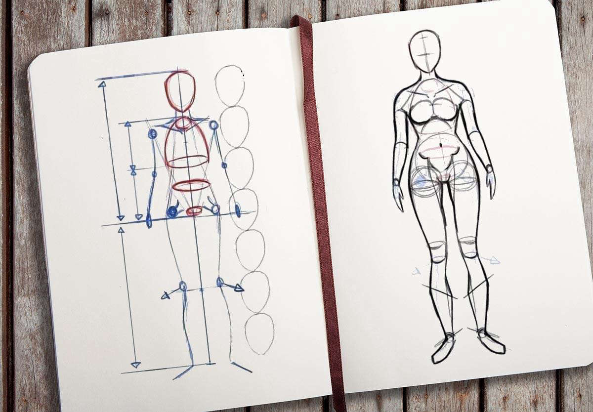 — Итак, смотри: сначала рисуем прямую линию. Разбиваем её на одинаковые отрезки. Один — голова, два — грудь… Заполняем их пока вот такими овалами. Тут рисуем планочку — это будущие плечи…