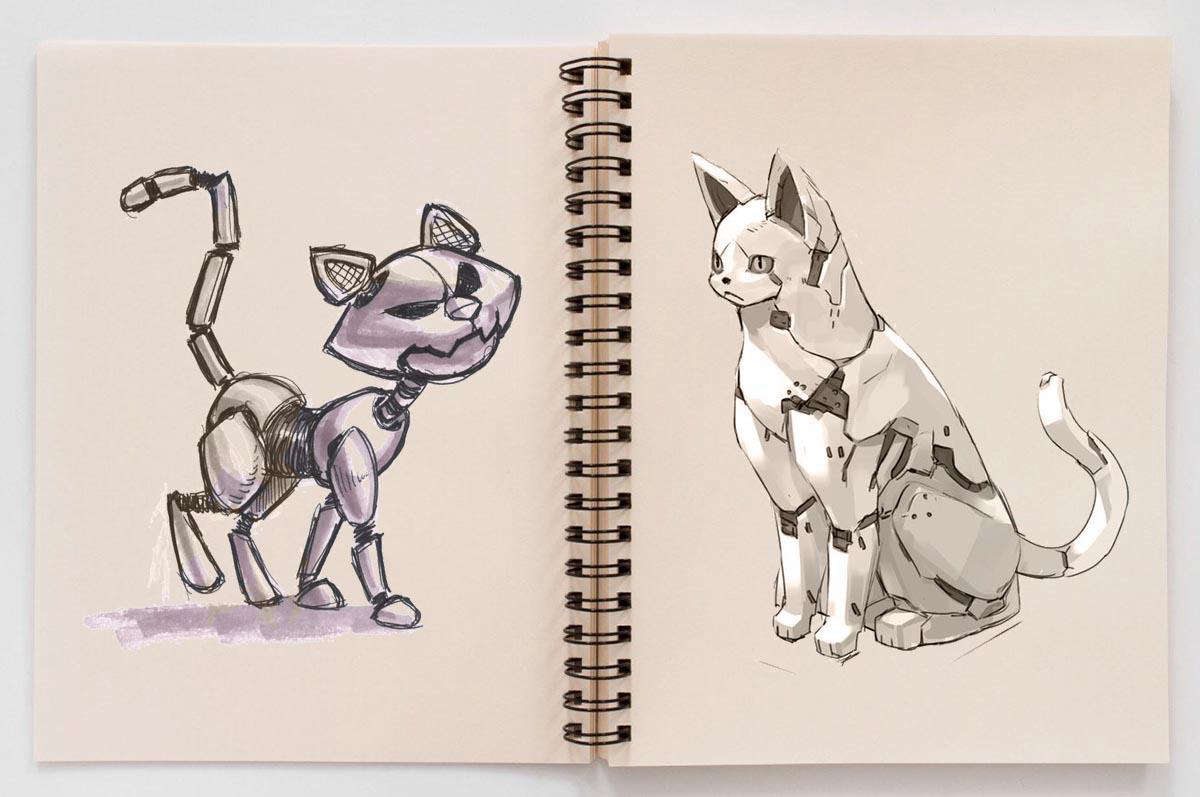 Нагма хочет рисовать маленьких кибер-котят для нашей героини, их не существует, приходится придумывать. Я показал пример, набросав ей киберкотиков разной степени няшности, и теперь ребёнка за уши не оттащить от скетчбука. Прилив художественного воображения перехлестнул плотину реализма и превратился в селевой поток, сметающий наши ресурсы карандашей, красок и бумаги. Я думал, что найденного на складе запаса нам хватит надолго…