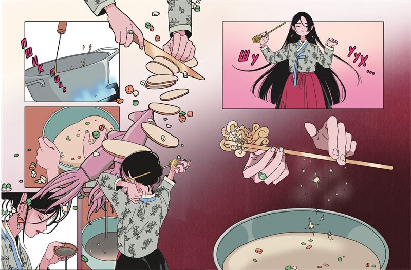 Шарики из кальмара один за другим последовали в сковородку, аппетитно скворча. Звук напомнил Чине шуршание летнего дождя. Пока шарики румянились, покрываясь золотистой корочкой, Тохваран готовила крем из разных овощей и чернил.