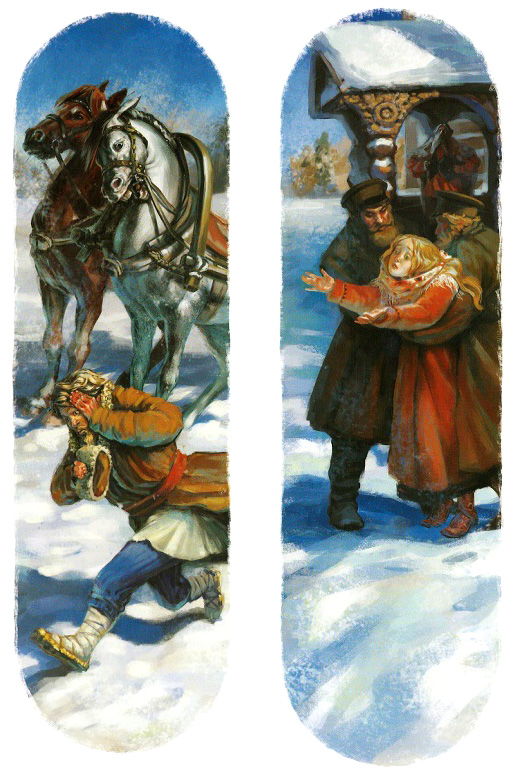 Как полдень минул, во двор сани въехали, а на них братья сидят. Лисавету держат, чтобы не убежала. Лисаветин отец на порог вышел: в рубахе красной, в накидке меховой и в черных сапогах смазных (не лапотник был — купец!). Лисавете ничего не сказал, а только рукой махнул своим сыновьям: «Ведите ее в дом, для разговора!» — а Петру на ворота указал. Лисавета, когда мимо Петра проходила, посмотрела на него и так молебно руки протянула, да Петр только глаза отвел и быстрее с ее двора побежал. Сам не помнит, как в Торбеево добрался. Приехал, в сено забрался и три дня там пролежал, от стыда и горя.