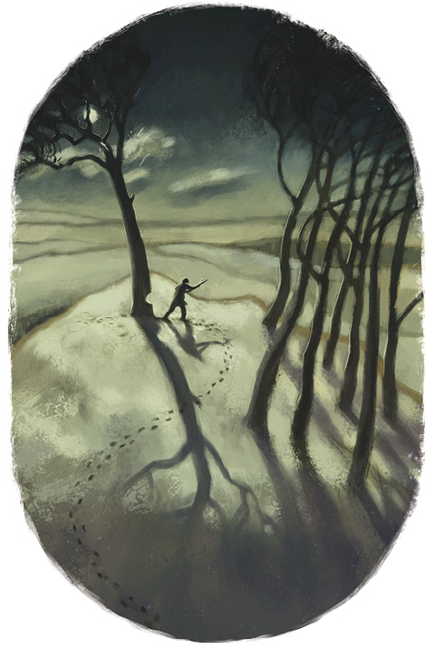 Понял тут Петр, откуда Лисавета его зовет и что ему делать надо. Взял топор, веревку и побежал в лес — в самый дальний бор на взгорье. Пробрался по талому снегу до самого высокого места и стал слушать. Вокруг лес под ветром шумит, ветками колышет, стволами трется, и каждое дерево скрипит по-своему: вот ясень, вот сосна, а вот ольха… Слышит тут Петр сквозь шум и скрип, будто голос женский его зовет. Пошел он на голос и видит — стоит над оврагом старая липа и качается. Только качается она не в лад со всеми деревьями, а по-своему, будто кто-то ее из-под земли толкает, будто хочет она корни из земли вырвать, взмахнуть тяжелыми ветвями и полететь в ночное небо.