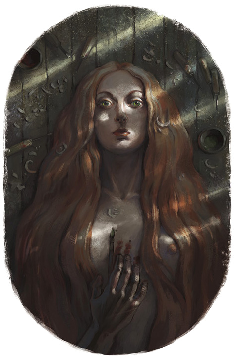 Подбежал Петр к этой липе и стал ее топором рубить. В полчаса повалил, ветки, сучья обтесал и потащил на веревке к деревне. Хорошо, до деревни все под горку было. Не успела еще луна зайти, как был Петр в сарае, зажег пять лучин и работать начал. Вытесал из колоды тело, ноги, руки, голову и за лицо принялся. Самыми тонкими резцами работает, каждую черточку милого лица повторить хочет, да тяжело ему — слезы глаза застевают, на руках мозоли кровоточат, ноги от усталости дрожат и подгибаются. Закончил Петр лицо делать, взял краски: стал волосы, брови, губы подрисовывать. Последним делом за глаза взялся. Достал он краску самую дорогую, изумрудную, и как только зрачки в глазах вывел — моргнули те глаза и на Петра уставились. Тут первый солнечный лучик сквозь щель в сарае пробился и девушку осветил. Помутилось у Петра в глазах и упал он без сознания.