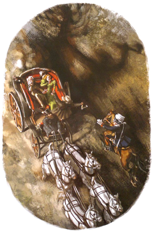 Как-то в начале мая слышит Петр на дворе звон колокольчиков, и родители его кличут. Вышел он, смотрит — стоит перед крыльцом коляска, шестериком запряженная, а в ней помещик Федор Павлович: усы белые, сам в охотничьем казакине, у ног два борзых пса лежат.