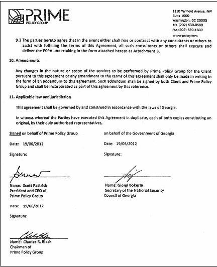 Контракт между Советом национальной безопасности Грузии и американской компанией «Прайм полиси групп», подписанный председателем «Прайм полиси групп» Чарльзом Блэком и президентом С. Р Пастриком. Ч. Блэк был старшим политическим советником сенатора Дж. Маккейна во время президентской кампании 2008 года, а С. Пастрик является членом Совета директоров американской неправительственной организации «Международный фонд избирательных систем», который осуществлял независимый мониторинг парламентских выборов 2012 года в Грузии Впрочем, в области легитимации выборов у режима Саакашвили были и другие покровители. Например, работающая с 2009 года на Национальный совет по безопасности Грузии лоббистская структура Prime Policy Group, а вернее, ее президент Р. Скотт Пастрик. Высокопоставленный лоббист одновременно входит в Совет директоров финансируемой из американского бюджета неправительственной организации «Международный фонд избирательных систем» (IFES).