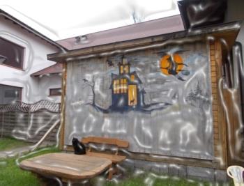 изображено панно с черным силуэтом ведьмы на метле. Рядом детская песочница и сам хозяин этих мест – большой, упитанный, черный кот. Кот к туристам давно привык и смотрит на них снисходительно. Даже разрешает себя погладить. Во владение кота входит так же маленький декоративный прудик с большим количеством рыбы.