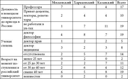 В отличие от физико-математических факультетов российских университетов, получивших в первое десятилетие XIX в. широкий спектр замечательных немецких ученых, надолго определивших развитие некоторых дисциплин, влияние немцев на нравственно-политических факультетах было ограничено, хотя в количественном отношении здесь и преподавало 13 человек (по 3–6 в каждом университете). Их деятельность практически никакого влияния не оказала на формирование преподавания юриспруденции в России, которое или развивалось благодаря отечественным профессорам (Л. А. Цветаев, H. Н. Сандунов в Московском, И. Ф. Тимковский в Харьковском университетах), или было очень слабым, как в Казани.