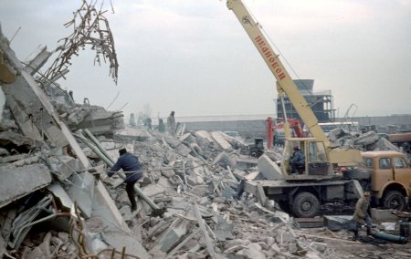 Мы вскрыли часть завала, но никого не нашли, и на следующий день перешли на другие объекты.Разборка завалов производилась вручную, – часть мусора сгребали лопатами, более крупные обломки вытаскивали и отбрасывали на улицу (или во двор). Иногда пускали в действие лом, кувалду. Крупные, неподъемные обломки поднимали краном и тоже складывали в сторону. Лопата в такой мешанине обломков работала очень плохо, поэтому много работали просто руками в рабочих рукавицах.