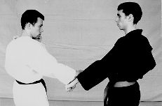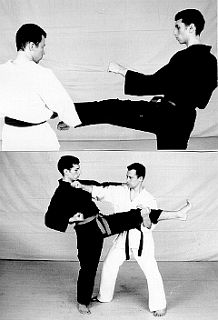Оба в правосторонней боевой стойке. Когда противник делает шаг правой ногой в вашу сторону, необходимо левой ногой выполнить маховое движение над полом в направлении противника по дуге, с одновременным захватом одежды на правой руке и груди противника. Ударив ступней по внешней стороне его большой берцовой кости, рукой захватить рукав противника, потянуть его вниз и выполнить подсечку (рис. 22).