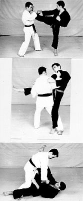 Противник наносит круговой удар правой ногой в голову. Выполняя блок путем подставки под удар правой ладони изнутри, левой захватываем его ногу под голень снизу, с одновременным шагом левой ноги вперед на место, где стояла правая нога противника. Далее правая рука захватывает одежду на груди противника, а правая нога в это же время ставится за пятку его опорной левой ноги. Одновременным движением правой руки вперед, а правой ноги назад выполняется подножка (рис. 18 а, б, в).