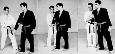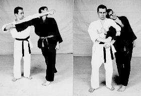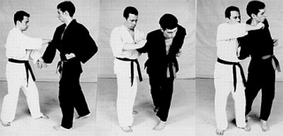 1. С шагом левой ноги нанести удар левой рукой в голову (нижнюю челюсть), одноименно правой произвести сильный рывок захваченной руки вдоль себя, скручивая ее наружу, и прижать ее к своей груди.