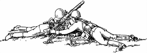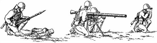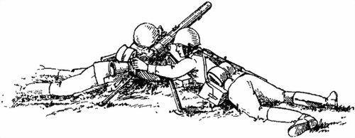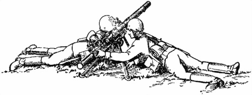 — кистью левой руки обхватывает маховичок механизма горизонтального наведения, предплечьем или локтем правой руки упирается в грунт, а кистью правой руки обхватывает маховичок механизма вертикального наведения (не касаясь большим пальцем гашетки);