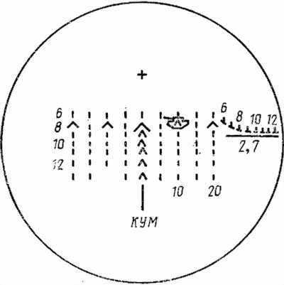 — вращая маховички, наводит в точку прицеливания вершину прицельной марки, соответствующей дальности до цели и поправке направления на боковой ветер и движение цели (рис. 42).