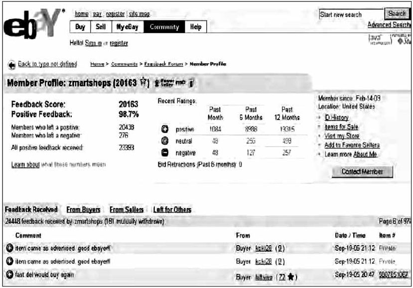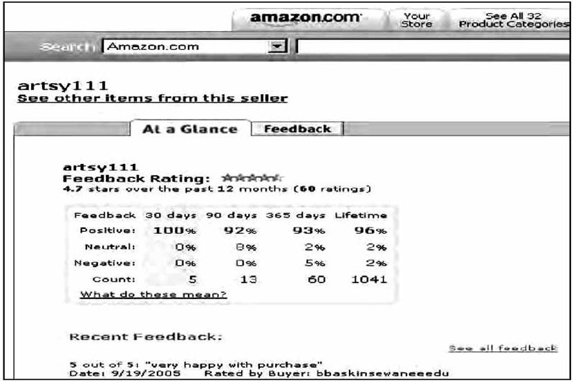 Между механизмами обратной связи eBay и Amazon есть два основных отличия. Во-первых, рейтинговая шкала Amazon более детализирована, чем шкала eBay (1–5 против – 1, 0, 1 соответственно), хотя Amazon также суммирует оценки по шкале eBay для облегчения обработки информации. Как мы увидим в следующем разделе, степень детализации рейтинговой шкалы – одно из ключевых измерений разработки механизма обратной связи. Выбор Amazon обрабатывать оценки также в режиме «положительно, нейтрально, отрицательно», как делает eBay, может указывать на то, что пользователи считают его применение более легким.