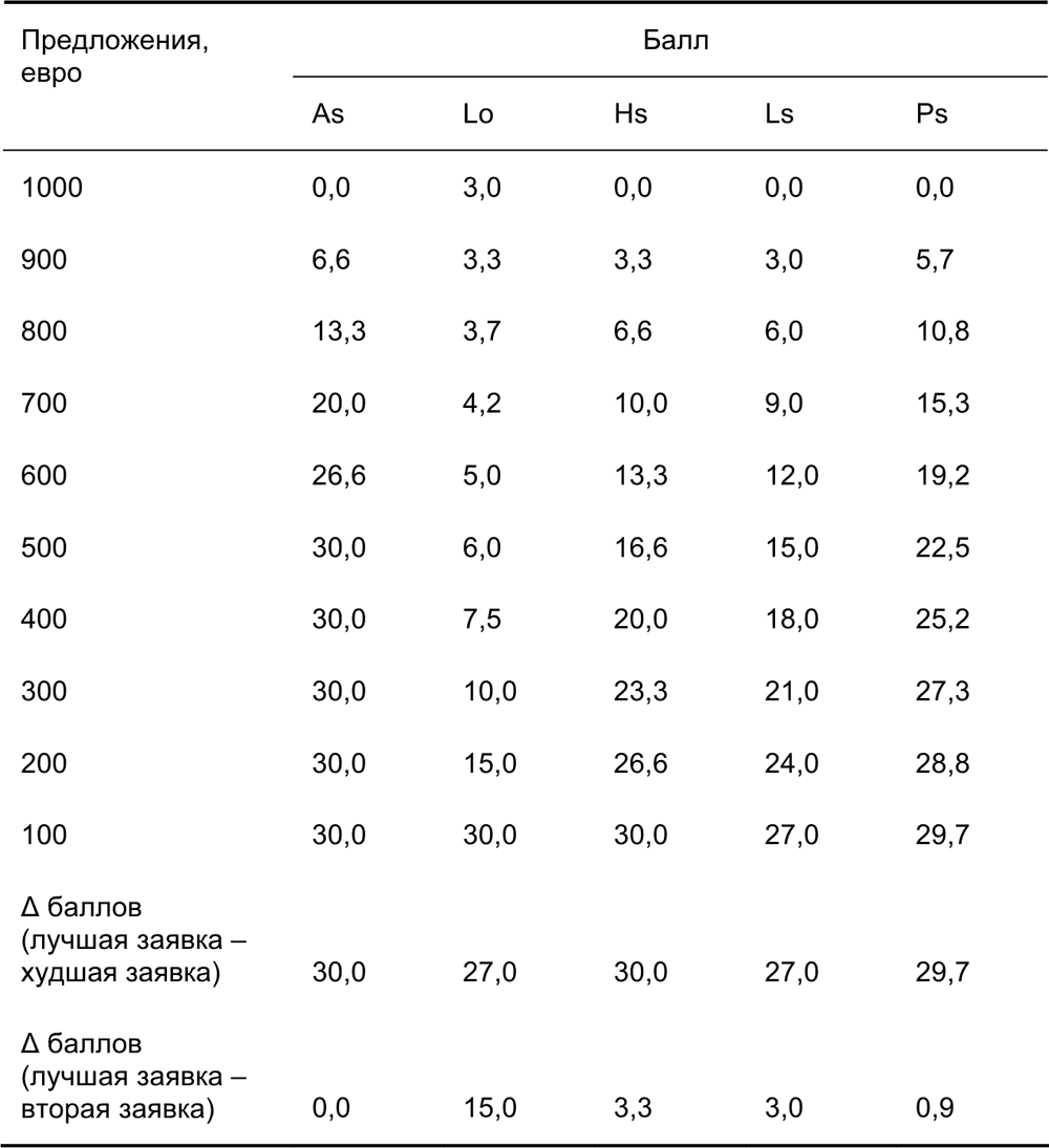 Вообще, при Lo никогда не назначается вся разность баллов, потому что при Lo всегда присуждает строго положительный балл самой высокой заявке, тогда как при Ls и Ps присуждаются вся разность баллов, только когда самая высокая заявка равна резервной цене и самая низкая заявка равна ценовому порогу.