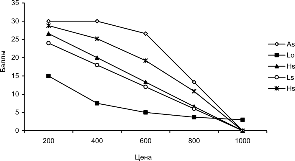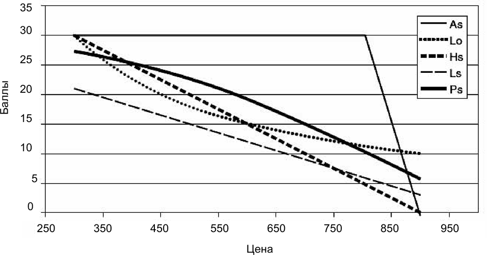 • при As, Hs и Ls балл растет линейно по мере уменьшения цены; при As балл растет до средней заявки, тогда как при Hs балл растет до самой низкой заявки и при Ls он растет до нулевой ценовой заявки;