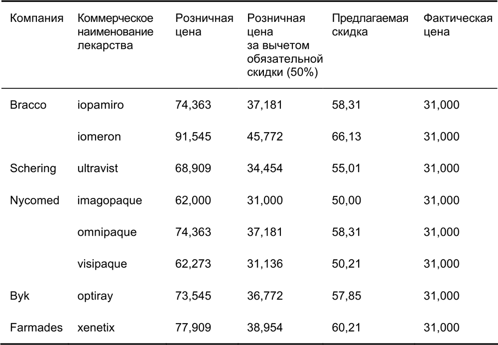 Довольно интересный пример этого подозрительного поведения приведен в табл. 14.1. В соответствии с итальянским законодательством, фармацевтические компании должны предлагать больницам и другим государственным учреждениям здравоохранения минимальную скидку в 50 % от розничной цены лекарства. В одном закупочном тендере, организованном МОЗ, пять компаний, некоторые из которых имели несколько видов продукции под различными коммерческими наименованиями, предложили очень разные скидки, которые варьировались от минимально требуемых законом (50 %) до более чем 66 %. Скидка в 50 % была предложена компанией с наименьшей розничной ценой, тогда как другие компании предложили более высокую скидку. Достаточно странно, что, применяя различные скидки, все компании в итоге запросили идентичную цену, которая фактически была максимальной ценой, которую они могли установить.