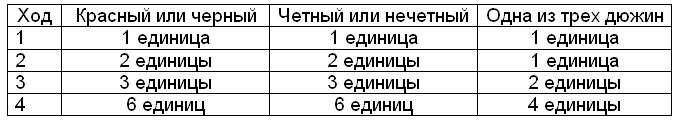 При первой ставке с одной единицей мы играем двойную ставку. Первый выигрыш приносит 2, первая двойная ставка 4, вторая двойная ставка 8 и третья двойная ставка – 16 единиц. Если первая ставка проигрывает или проигрывает одна из трех двойных ставок, то делается вторая ставка с двумя единицами с целью провести только две двойные ставки. Первый выигрыш приносит 4, первая двойная ставка 8, вторая двойная ставка 16 единиц. Если при этом ходе получается потеря, то следует третья ставка с 4 единицами и с целью провести еще только одну двойную ставку. Если эта также проигрывает, то делается четвертая ставка в 8 единиц. Двойная ставка при этом ходе исключается.
