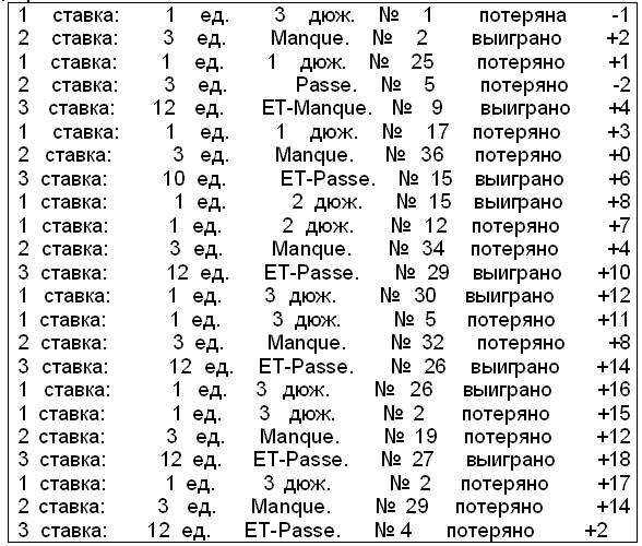 Двенадцать единиц размещаются следующим образом: 9 единиц на появляющиеся Passe или Manque, 3 единицы на соответствующие поперечные, при ET-Passe на 13–18, при ЕТ-Manque на поперечные 19–24. Если ЕТ-ставка выигрывает, то мы получаем назад потерянное и еще плюс 2 единицы, которые, как мы видим, достигаются при каждом выигрышном ходе в предварительной части.