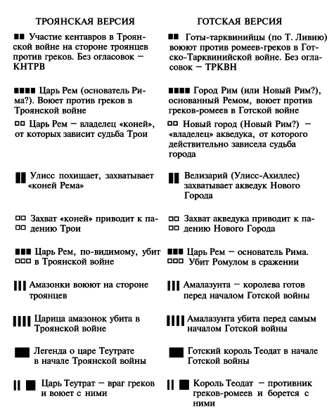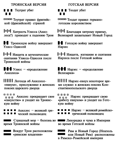 Рис. 19. Сравнение более мелких событий античной Троянской войны (скалигеровская датировка: XIII век до н. э.) и средневековой Готской войны якобы в Италии (скалигеровская датировка: VI век н. э.)