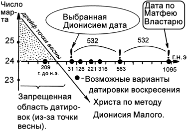 Рис. 27. Почему средневековые хронологи в качестве даты Воскресения Иисуса Христа выбрали именно 31 год н. э.? Потому что это была самая ранняя возможная для них дата. Иначе нарушались календарные условия Воскресения: из-за векового смещения точки весны в юлианском календаре, 24 марта в эпоху до н. э. было раньше точки весны и поэтому не могло быть первым весенним полнолунием (ХIV луной). Поэтому средневековые хронологи просто не могли датировать Рождество Христово ранее, чем началом н. э.