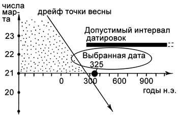 В случае датировки Рождества Христова хронолог XVI века знал, что в год Воскресения Христа весеннее полнолуние приходилось на 24 марта (он считал, что воскресенье было 25 марта, а значит, накануне, 24 марта, должна праздноваться иудейская пасха). Получалось, что точка весны не могла быть позднее 24 марта. Расчет показывает, что точка весны приходилась на 24 марта около 100 года до н. э., а ранее этого времени – уже на более поздние числа марта. Значит, наш воображаемый хронолог не мог датировать Рождество Христово ранее 100 года до н. э. Реальный средневековый хронолог «не дотянул» до нижней границы всего на 100 лет – но ведь надо было и другим условиям удовлетворять!